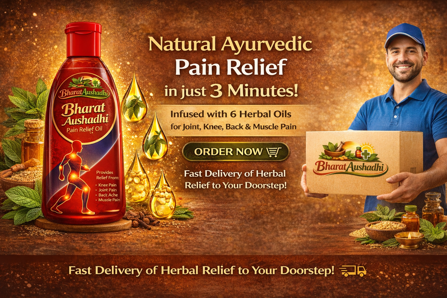 Bharat Aushadhi Pain Relief Oil is specially formulated with 6 powerful herbal oils to provide fast, natural, and effective relief from joint, knee, back, and muscle pain — in just 3 minutes.